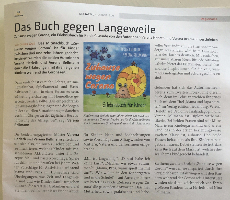 Der Neckartal Anzeiger hat einen Artikel zu unserem Erlebnisbuch für Kinder während der Corona Krise gebracht. Ich freue mich ihn hier mit euch zu teilen.