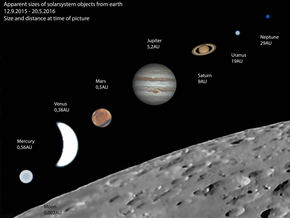 Größe und Abstand der Planeten entsprechen in etwa dem Aufnahmedatum. Dabei ist die Astronomische Einheit (abgekürzt AE, international AU für englisch astronomical unit) laut Definition AU = 149 597 870 700 Meter. Das ist ungefähr der mittlere Abstand zwischen Erde und Sonne.