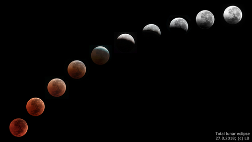 Ein echtes Highlight - der Blutmond am 27. Juli 2018! Beobachtet vom Ingersheimer Feld. Ein unvergessliches Erlebnis! Oben ein Einzelbild, und unten eine Collage aus den aufgenommenen Bildern.