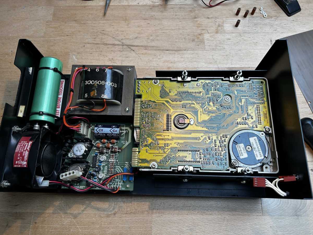 Vorteil der etwas moderneren Seagate ist auch, dass diese über eine Autopark Funktion verfügt. Das verhindert, dass die Leseköpfe beim Ausschalten der Festplatte unkontrolliert auf die Magnetscheiben aufschlagen und dort kleine Schäden verursachen. Nach mehreren Versuchen gelang es mir die Festplatte erfolgreich zu formatieren. Das war langwierig, da jede Formatierung ganze 1,5h benötigt. Dabei wurde klar, dass die Festplatte für eine normale Funktion etwa 15min warmlaufen muß. Ich vermute, dass das an den verbauten Kugellagern und dem darin enthaltenen Lagerfett liegt, was in den letzten 40 Jahren vorraussichtlich etwas ranzig geworden ist. Vielleicht tausche ich diese Lager mal in der nächsten Zeit noch aus.