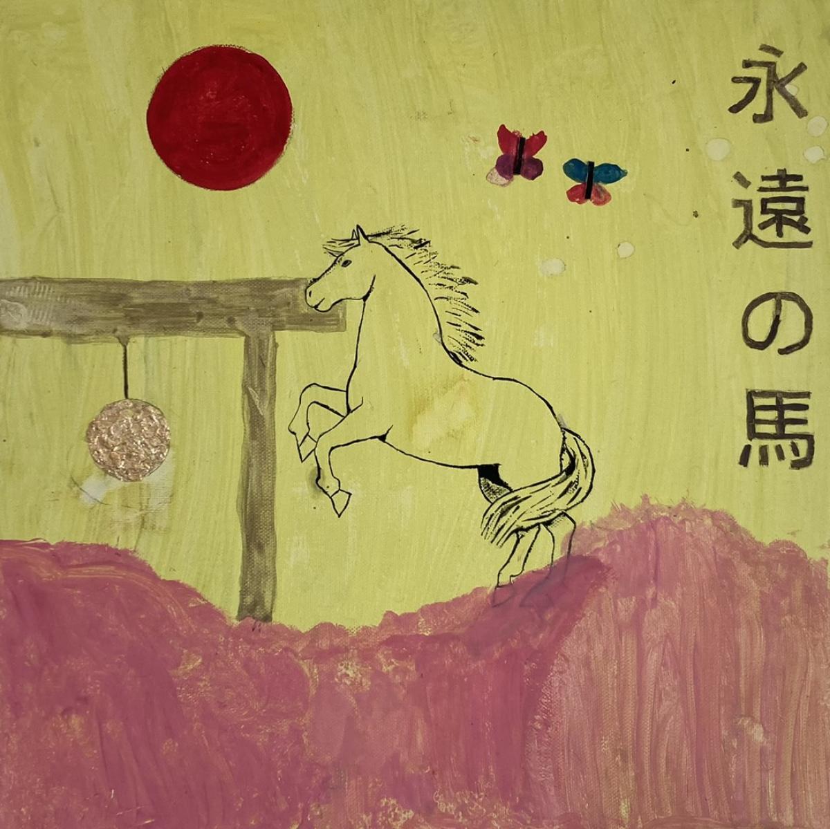 Acryl auf Leinwand in pastellfarbenen Tönen. Rechts in Kanji geschrieben der Schriftzug "Pferd der Ewigkeit".