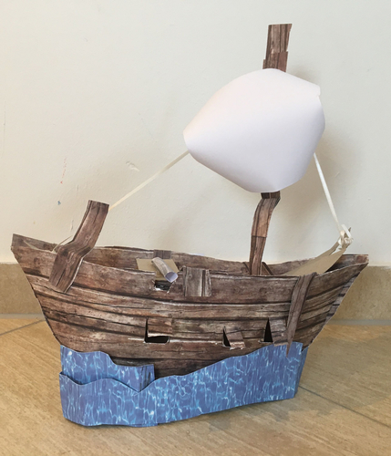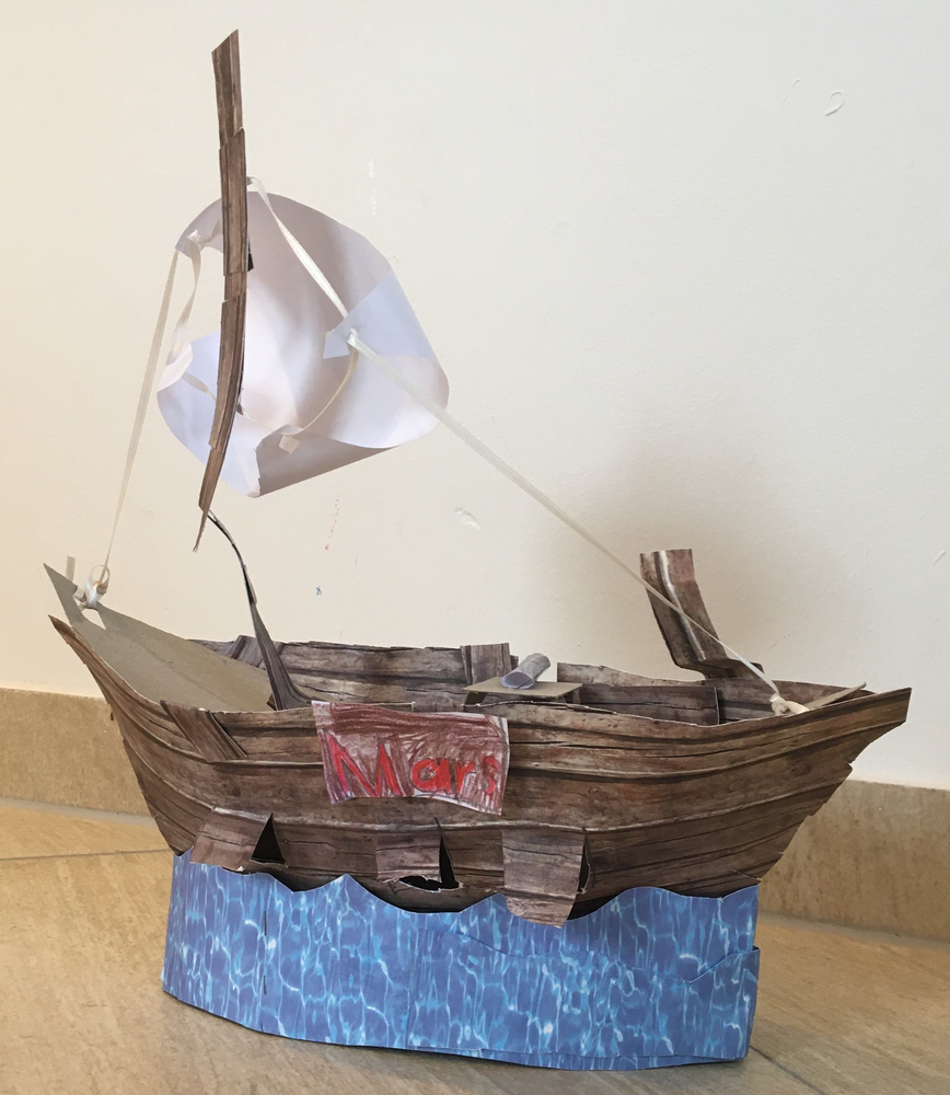 Eine Terra X Sendung zu der Mars inspirierte zu dem Bau dieses Schiffmodels. Es ist vollständig aus Pappe mit Holzstruktur. Die Kanone ist zur Abwehr der Feinde da.